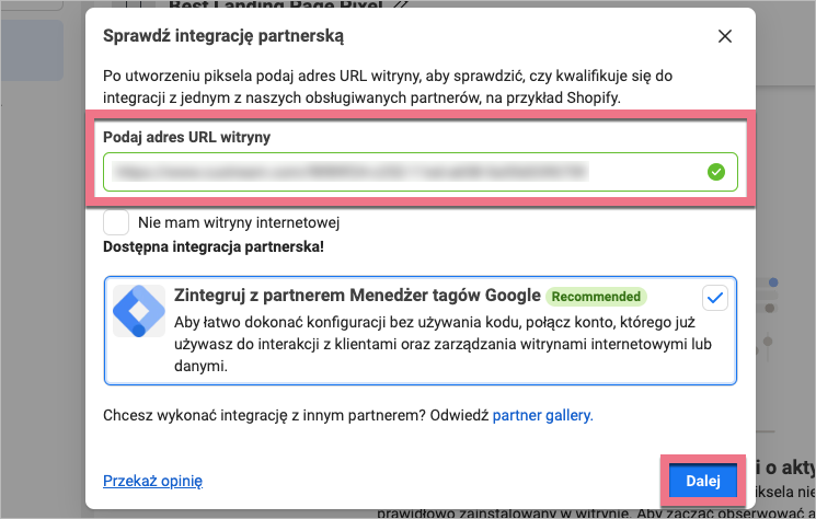 5. Aby sprawdzić opcje konfiguracji partnerskich, wprowadź adres URL landing page’a – możesz np. zintegrować się z Menedżerem tagów Google; lub od razu kliknij Dalej.