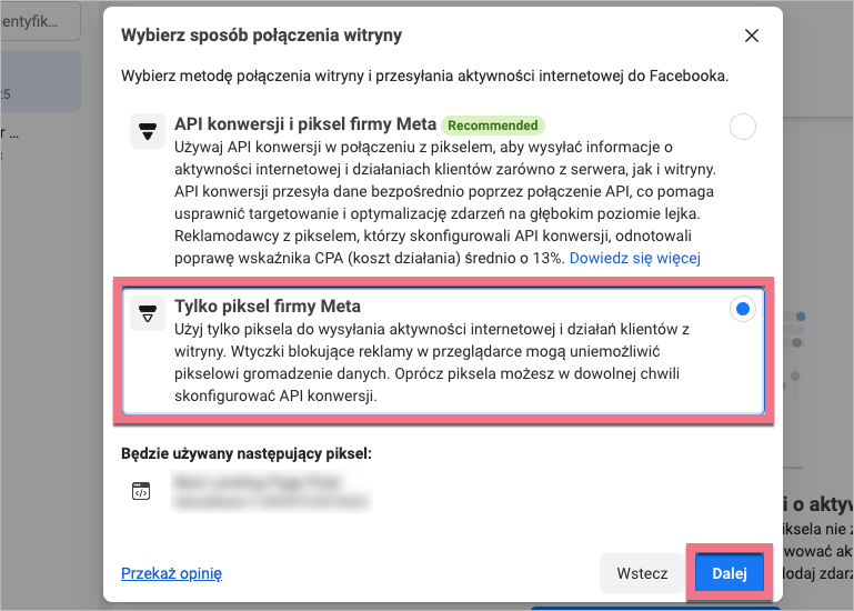 6. Wybierz Tylko piksel firmy Meta, jeśli nie masz skonfigurowanego API konwersji.