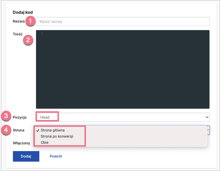 5. Wpisz nazwę kodu (1). Wklej skopiowany kod (2) i wybierz pozycję Head (3). Następnie wybierz Stronę główną lub Stronę po konwersji (4) i kliknij w Dodaj.