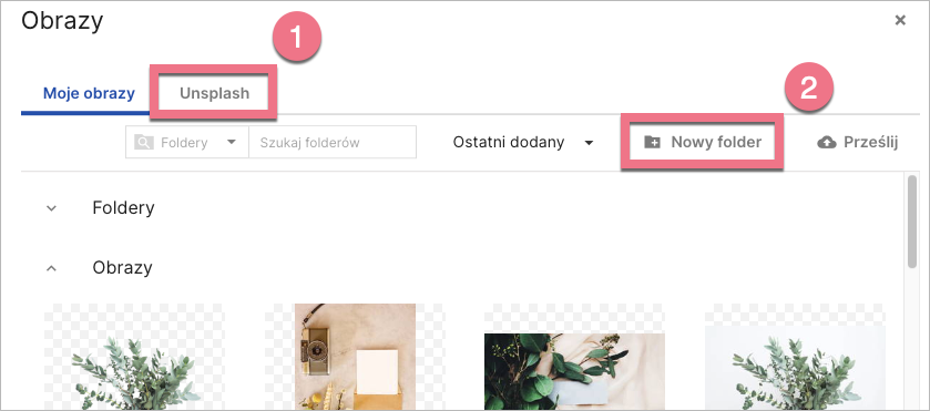 2. Zakładkę Unsplash (1) znajdziesz po lewej stronie panelu. Możesz utworzyć nowy folder (2), aby posegregować swoje obrazy.