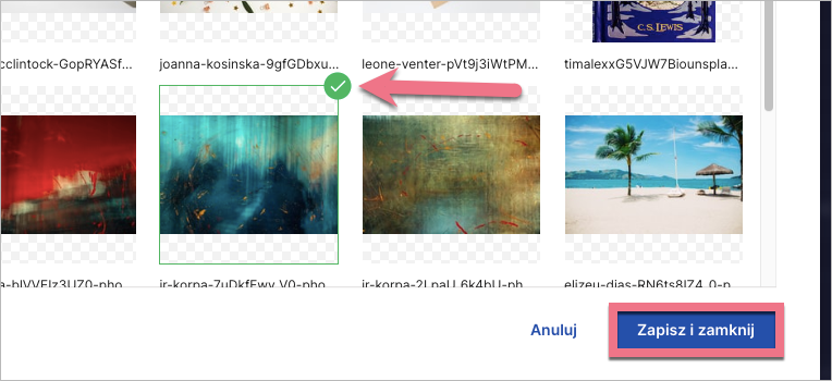 5. Gdy obraz Unsplash zostanie załadowany do galerii, kliknij w niego dwukrotnie lub zaznacz go i kliknij Zapisz i zamknij, aby dodać go do projektu.