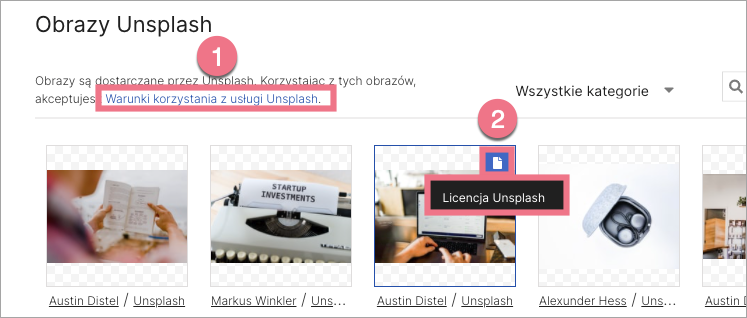 4. W lewym górnym rogu galerii znajduje się link do Warunków korzystania z usługi Unsplash (1), a przy każdym obrazie możesz w każdej chwili uzyskać dostęp do Licencji Unsplash (2).
