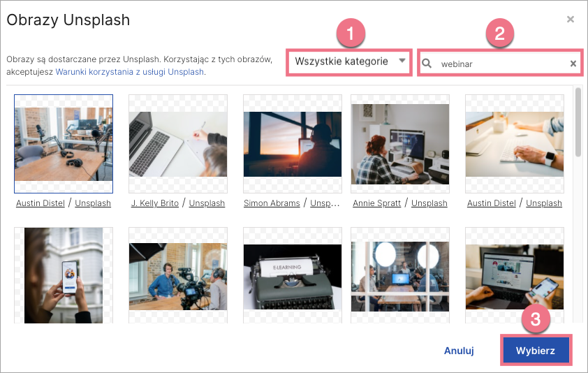 3. Filtruj obrazy według kategorii (1) – kategorie mogą się zmieniać w zależności od aktualnych trendów – lub skorzystaj z wyszukiwarki (2). Zaznacz obraz i kliknij Wybierz (3) lub kliknij w obraz dwukrotnie. Wybrane obrazy znajdziesz w zakładce Moje obrazy.