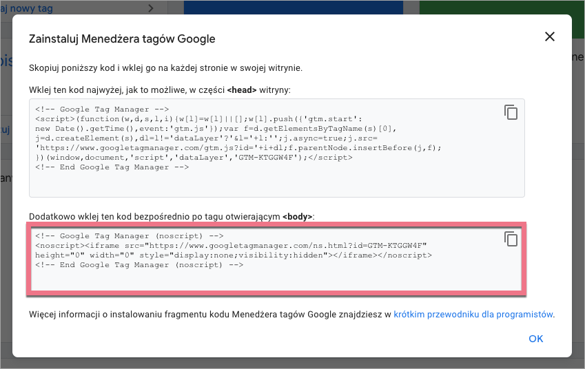 3. Gdy wyświetlą się kody instalacyjne Google Tag Managera, skopiuj pierwszy z nich.