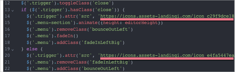 15. W wierszach 14 i 20 zmień adresy https://linkdozamkniecia.svg i https://linkdootwarcia.svg na adresy ikon skopiowane z landing page’a – odpowiednio na adres ikony zamykającej i adres ikony otwierającej menu.