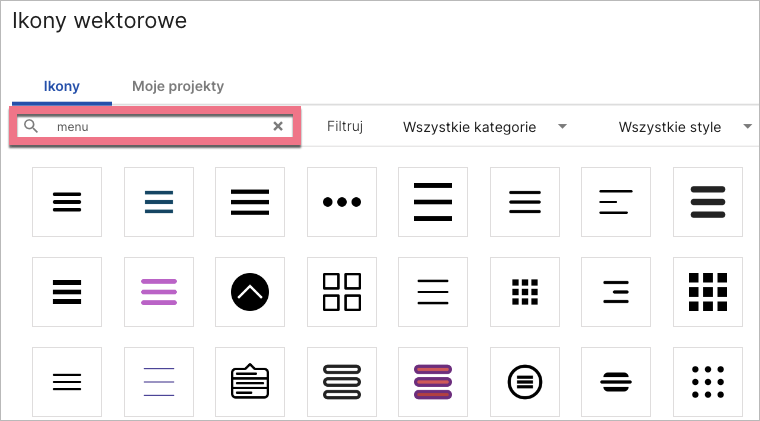 4. Wyszukaj menu i wybierz jedną z ikon (możesz też wybrać zupełnie inną ikonę).