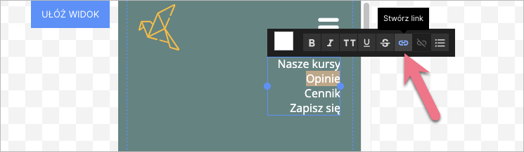 5. W nowo utworzonej sekcji stwórz swoje menu nawigacyjne. Możesz je stworzyć z dowolnych elementów i widgetów. W naszym przykładzie wykorzystaliśmy widget Tekst. Rozwijanie i zwijanie menu będzie dostępne po publikacji. Każdą pozycję w menu podlinkuj albo do wybranej sekcji landing page’a, albo do zewnętrznego adresu URL.