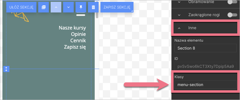 6. Zaznacz sekcję i w toolbarze po prawej stronie odszukaj zakładkę Inne. Wpisz menu-section w polu Klasy.