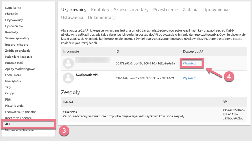 2. Następnie z lewego menu wybierz API (3) i kliknij Wyświetl (4) przy odpowiedniej nazwie użytkownika.