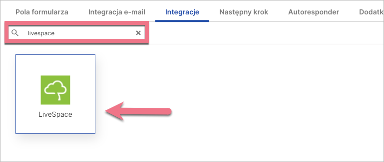 3. W zakładce Integracje wybierz LiveSpace. Wpisz nazwę integracji w wyszukiwarce i kliknij enter.