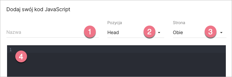 3. Nadaj nazwę (1) i wybierz pozycję Head (2) na obu (3) stronach. Wklej kod śledzący w pole treści (4). Zapisz, klikając Dodaj kod.