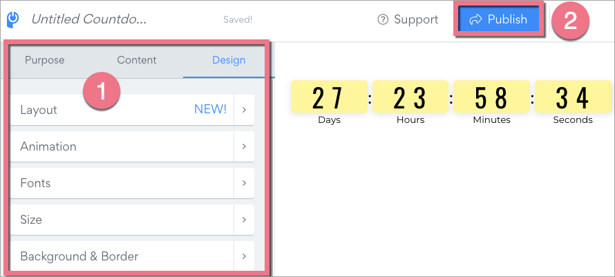 4. Dostosuj (1) wygląd, cel i treść aplikacji. Następnie kliknij Publish (2).