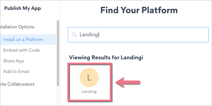 5. Po opublikowaniu wyszukaj platformę Landingi i wybierz ją.