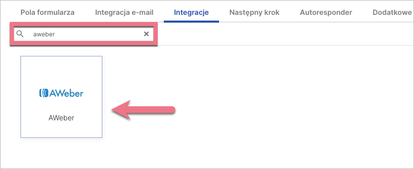 2. W zakładce Integracje wybierz AWeber. Wpisz nazwę integracji w wyszukiwarce i kliknij enter.