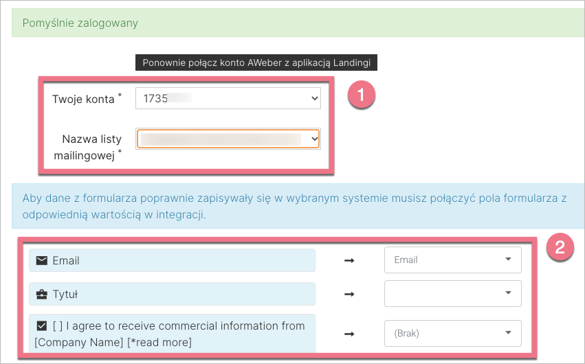 5. Po pomyślnym zalogowaniu w szczegółach integracji zobaczysz numer Twojego konta w AWeber oraz nazwy utworzonych list mailingowych. Wybierz z menu odpowiednie Konto oraz Listę mailingową (1). Następnie połącz pola formularza z odpowiednią wartością pola w AWeber (2).