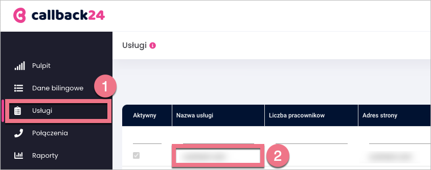 2. Przejdź do zakładki Usługi (1) i w sekcji Nazwa usługi wybierz swoją stronę (2).