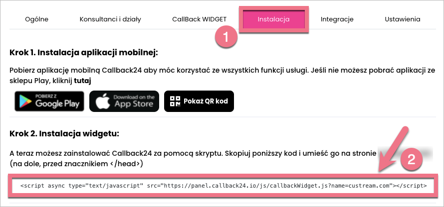 3. W zakładce Instalacja (1) odszukaj Krok 2. Instalacja widgetu i skopiuj podany tam kod (2).