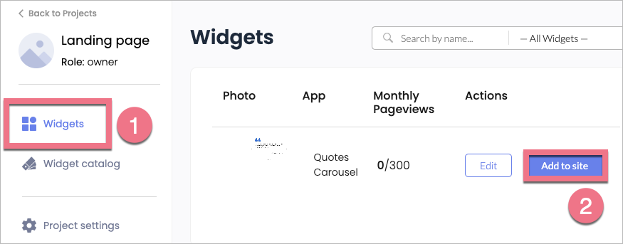 3b. W zakładce Widgets (1) znajdź widget, który chcesz osadzić. Kliknij przycisk Add to site (2) znajdujący się obok niego.