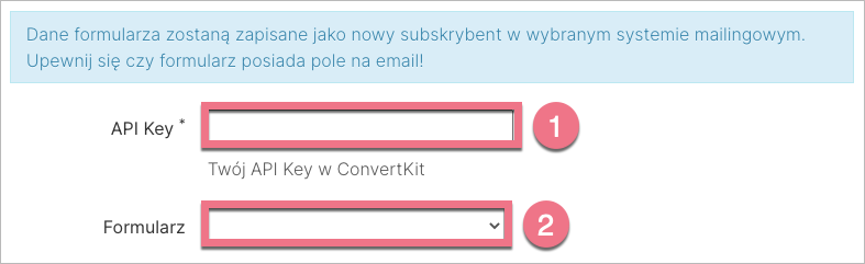 4. Wklej klucz w polu API Key (1). W polu Formularz (2) automatycznie załaduje się formularz zdefiniowany wcześniej w platformie Kit, do którego zostaną przesłane dane leadów.