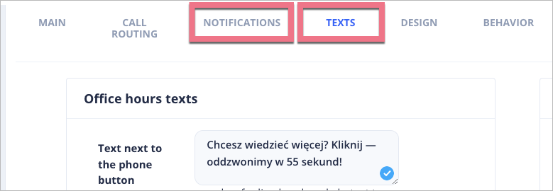 2. Treść wiadomości i powiadomień dodasz w zakładce Notifications oraz Texts. Po dokonaniu zmian kliknij Save.