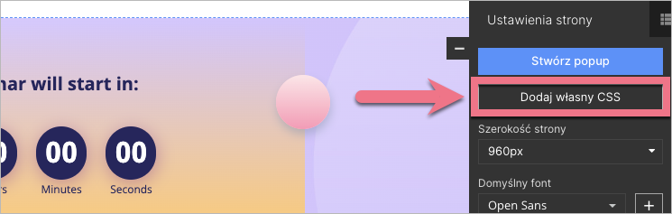 4. Aby widget połączenia telefonicznego był widoczny nad innymi elementami strony, musisz dodać do landing page’a kod CSS. Przejdź do edytora i Ustawień strony, a następnie kliknij Dodaj własny CSS.