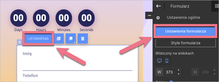 1. W edytorze Landingi dodaj widget Formularz. Kliknij go i przejdź do jego Ustawień.