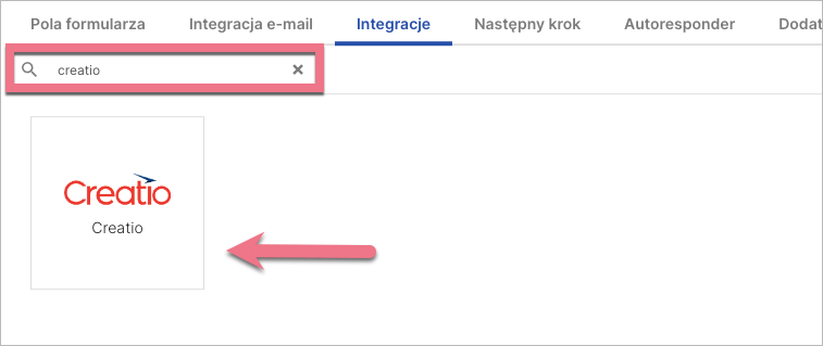 3. W zakładce Integracje wybierz Creatio. Wpisz nazwę integracji w wyszukiwarce i kliknij enter.