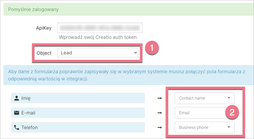 5. Po zalogowaniu wybierz Obiekt (1), a następnie połącz pola formularza (2) z odpowiednimi wartościami w Creatio.