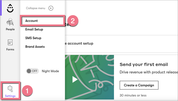 2. W lewym dolnym rogu kliknij Settings (1) i wybierz Account (2) z menu, które się rozwinie.