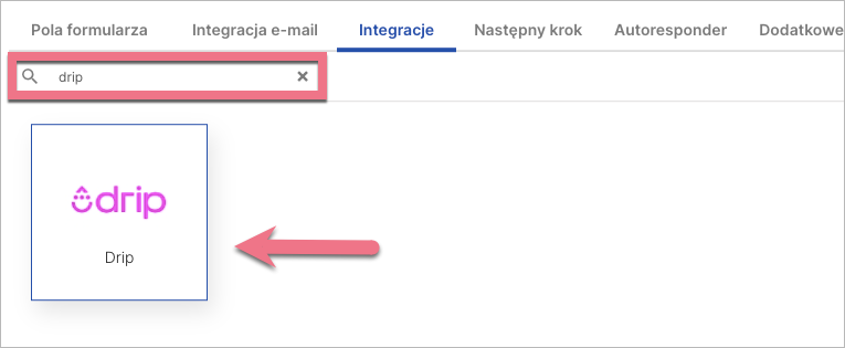 3. W zakładce Integracje wybierz Drip. Wpisz nazwę integracji w wyszukiwarce i kliknij enter.