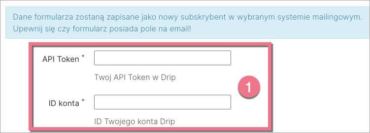 4. W polach API Token i ID konta (1) wklej odpowiednie wartości pobrane z platformy Drip.