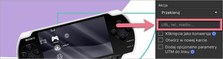 2. Kliknij w przycisk, który ma przekierowywać do strony płatności. W panelu po prawej stronie odszukaj zakładkę Akcja po kliknięciu i wybierz Przekieruj jako akcję.
