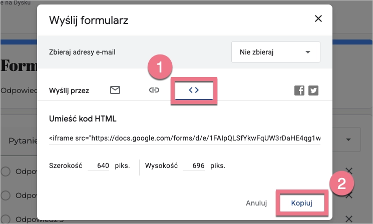 3. Wybierz Umieść (1), a następnie Kopiuj (2). Możesz w tym miejscu także dostosować szerokość i wysokość formularza/ankiety.