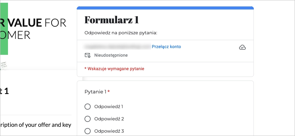 W Google Forms możesz tworzyć i udostępniać formularze oraz ankiety, a następnie analizować odpowiedzi w czasie rzeczywistym. Z tej instrukcji dowiesz się, jak umieścić taki formularz lub ankietę na Twoim landing page’u w Landingi.
