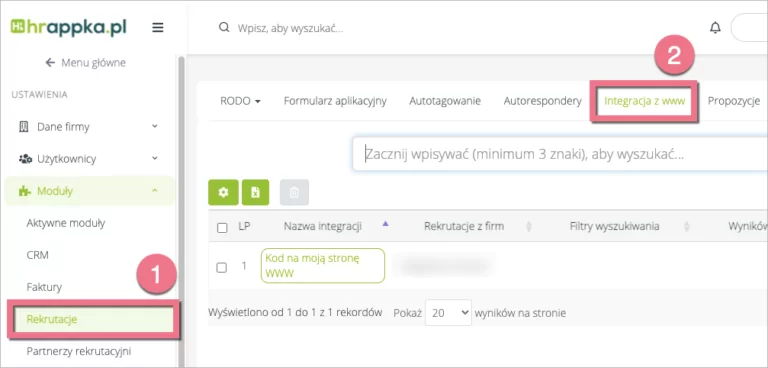 2. Rozwiń menu Moduły i wybierz Rekrutacje (1). Następnie przejdź do zakładki Integracja z www (2).