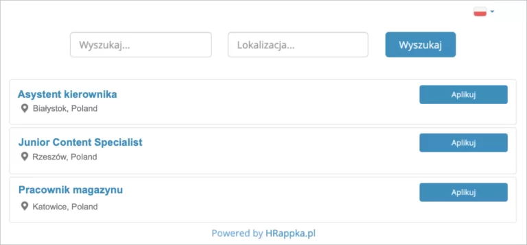 HRappka to system HR, który automatyzuje kluczowe procesy HR. Możesz zintegrować to narzędzie ze swoim landing page’em, aby wyświetlać na nim widget HRappki z Twoimi aktualnymi ofertami pracy i zarządzać rekrutacjami w jednym miejscu.
