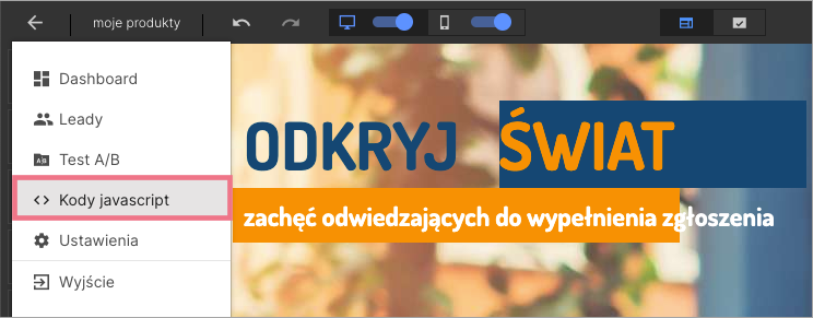 Do zakładki kody JavaScript możesz przejść także z poziomu edytora wybranego landing page’a.