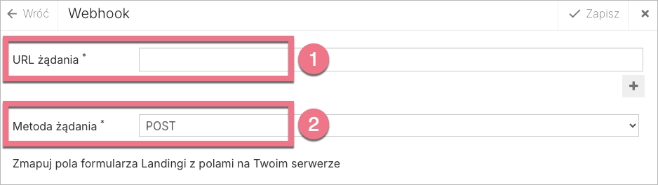 4. Wklej adres URL Webhook (1) i wybierz POST (2) jako metodę żądania. Zapisz zmiany.