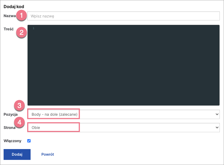 3. Wpisz nazwę (1), wklej kod (2) i wybierz Body – na dole (3) i Obie (4). Kliknij w Dodaj.