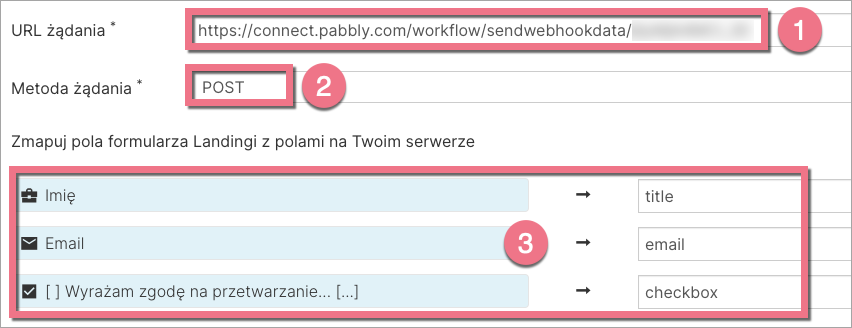 4. W polu URL żądania (1) wklej webhook skopiowany z Pabbly Connect. Jako Metodę żądania wybierz POST (2). Następnie połącz pola formularza z polami w integracji.