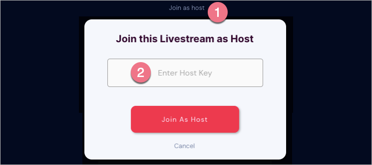 Przejdź do transmisji, kliknij Join as host (1) i wklej klucz w pole Enter Host Key (2).