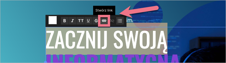 Przejdź do edytora landing page’a i zaznacz tekst, który ma przekierowywać do transmisji. Kliknij Stwórz link w menu kontekstowym.