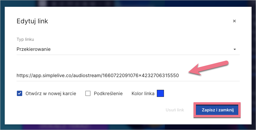 W nowym oknie wybierz Przekierowanie jako Typ linku i wklej link w pole URL. Zaznacz box Otwórz w nowej karcie i kliknij Zapisz i zamknij.