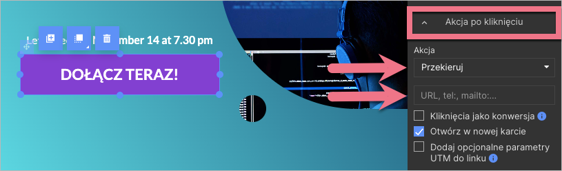 Przejdź do edytora landing page’a i wybierz przycisk, który ma przekierowywać do transmisji. W panelu po prawej stronie rozwiń zakładkę Akcja po kliknięciu. Wybierz Przekieruj jako Akcję i wklej link w pole URL. Zaznacz box Otwórz w nowej karcie.