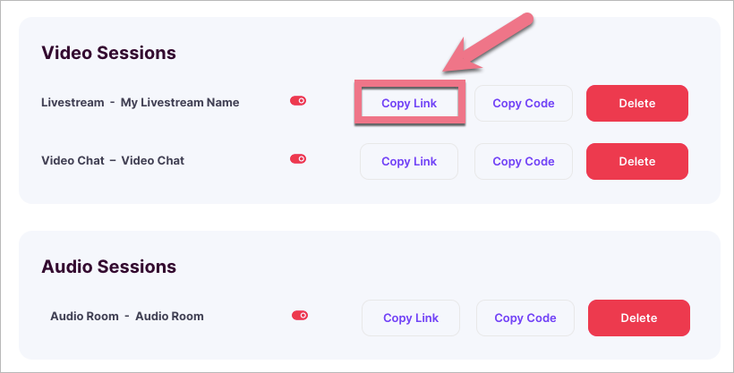 4. Nowa transmisja zostanie dodana do odpowiedniej sekcji. Kliknij Copy Code obok wybranej transmisji.