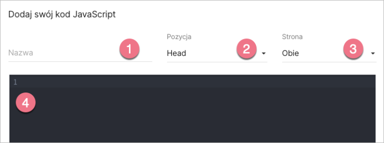 4. Nadaj nazwę (1) i wybierz pozycję Head (2) na obu (3) stronach. Wklej kod w pole treści (4).