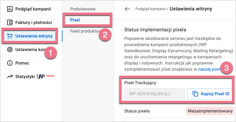 2. Przejdź do zakładki Ustawienia witryny (1) > Pixel (2), a następnie skopiuj (3) numer swojego pixela.