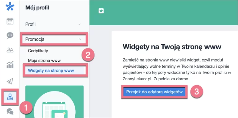 2. Przejdź do ustawień profilu (1), następnie wybierz Promocja > Widgety na stronę www (2). Kliknij Przejdź do edytora widgetów (3).