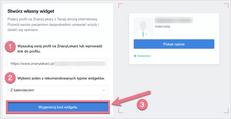 3. Wklej lub wyszukaj link do swojego profilu (1) i wybierz rodzaj widgetu (2). Na koniec kliknij Wygeneruj kod widgetu (3). Po prawej stronie zobaczysz jego podgląd