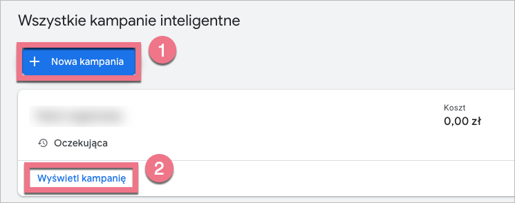 1. Zaloguj się na swoje konto Google Ads, utwórz nową kampanię (1) lub wybierz istniejącą kampanię i kliknij Wyświetl kampanię (2).
